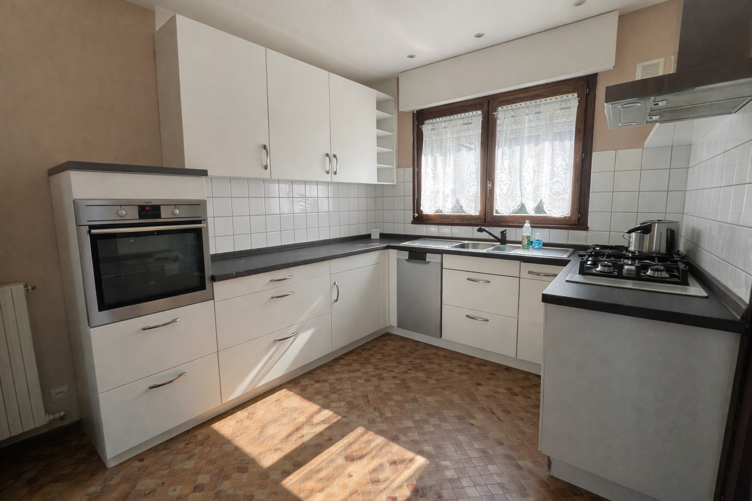 - A l'étage : une entrée, un séjour, une cuisine équipée (plaque vitrocéramique, four, lave-vaisselle, hotte), une chambre, une salle de bain et un WC séparé avec lave main.
