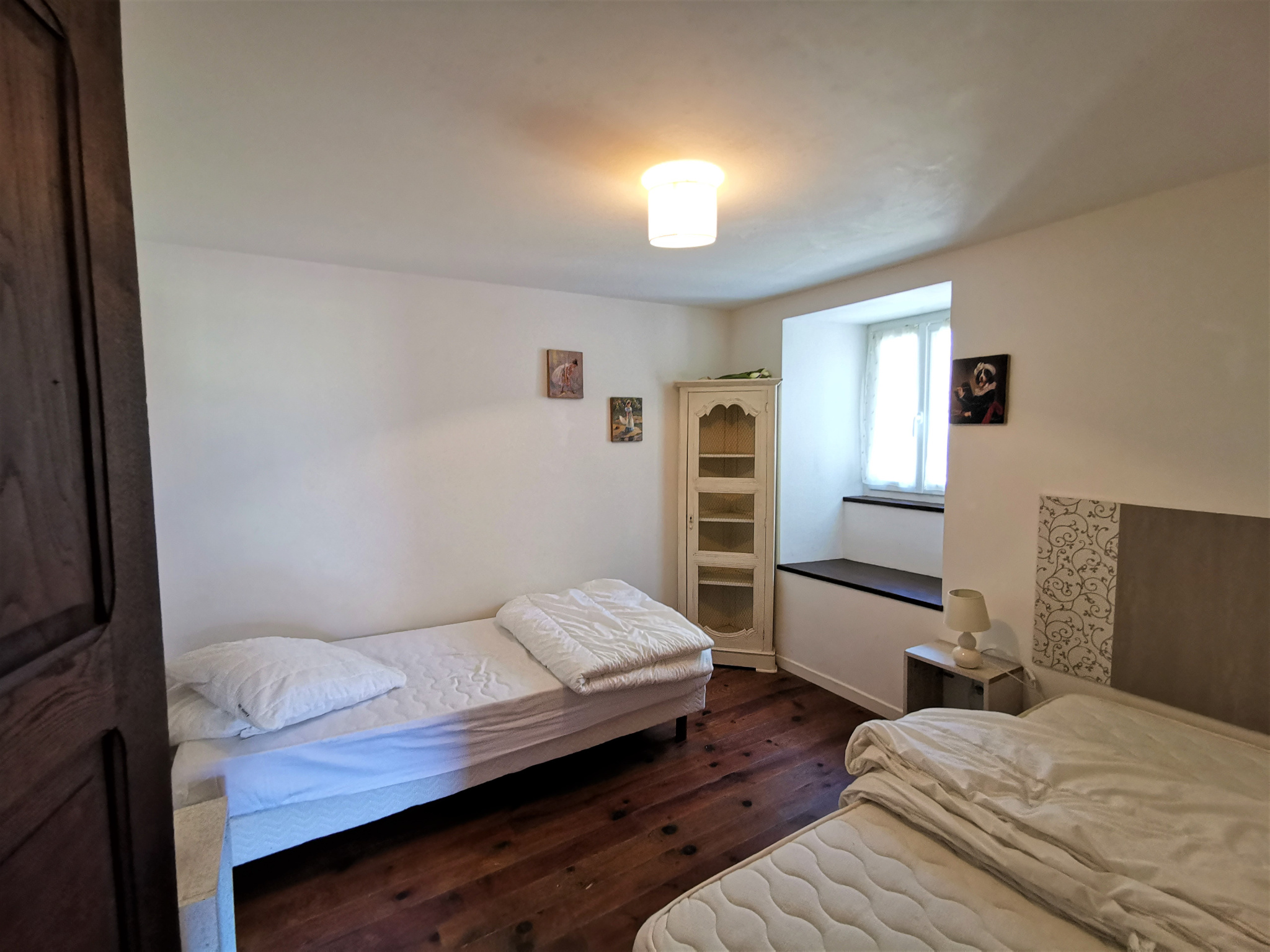 L'appartement s'ouvre sur une pièce de vie accueillante et chaleureuse donnant accès vers une cuisine équipée (plaque, hotte, lave-vaisselle et réfrigérateur) séparée avec coin salle à manger et une salle d'eau avec wc. A l'étage, un dégagement mène à 3 chambres et une salle de bain ave baignoire.