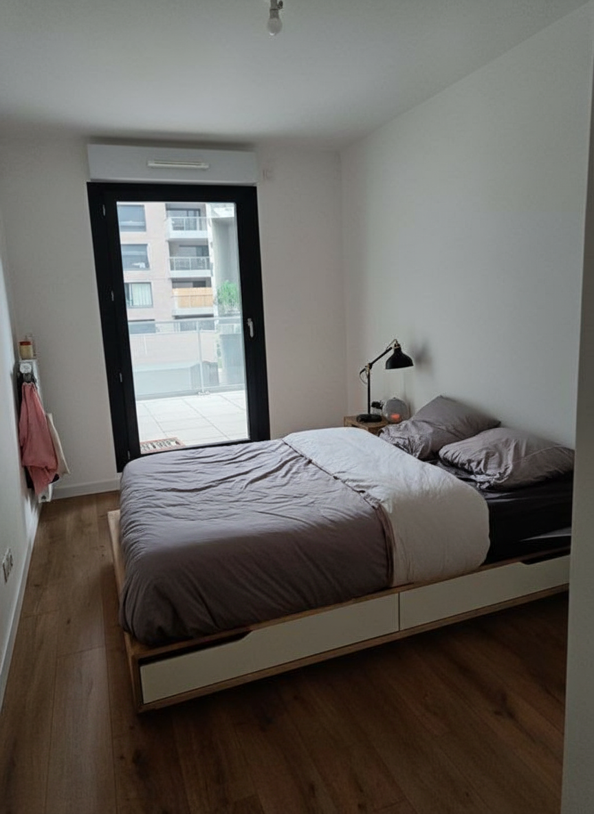 La chambre qui vous est destinée constitue un véritable havre de paix. Elle bénéficie d'un bel espace optimisé comprenant de vastes rangements intégrés. Son atout majeur réside dans sa porte-fenêtre lumineuse qui s'ouvre directement sur un superbe balcon, un espace extérieur privilégié et particulièrement agréable pour profiter des beaux jours ou partager des moments de détente. La chambre est louée non meublée, vous laissant ainsi l'entière liberté d'y installer votre propre lit et votre matelas pour créer un cocon à votre image.