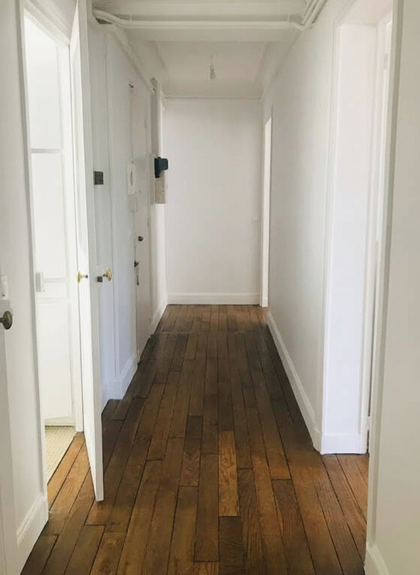 Dès l'entrée, vous serez charmé par l'authenticité des lieux : le charme de l'ancien a été soigneusement préservé avec son magnifique parquet d'origine et ses élégantes moulures au plafond. L'appartement s'articule autour d'un long couloir traversant qui dessert de manière optimale les différents espaces. La pièce de vie principale se compose d'un vaste double-séjour d'environ 25 m² donnant sur la rue. Baigné de lumière naturelle, cet espace de réception est chaleureux et convivial, aménagé avec goût (comprenant un bahut, une commode, des placards, ainsi qu'une table à manger et ses chaises).