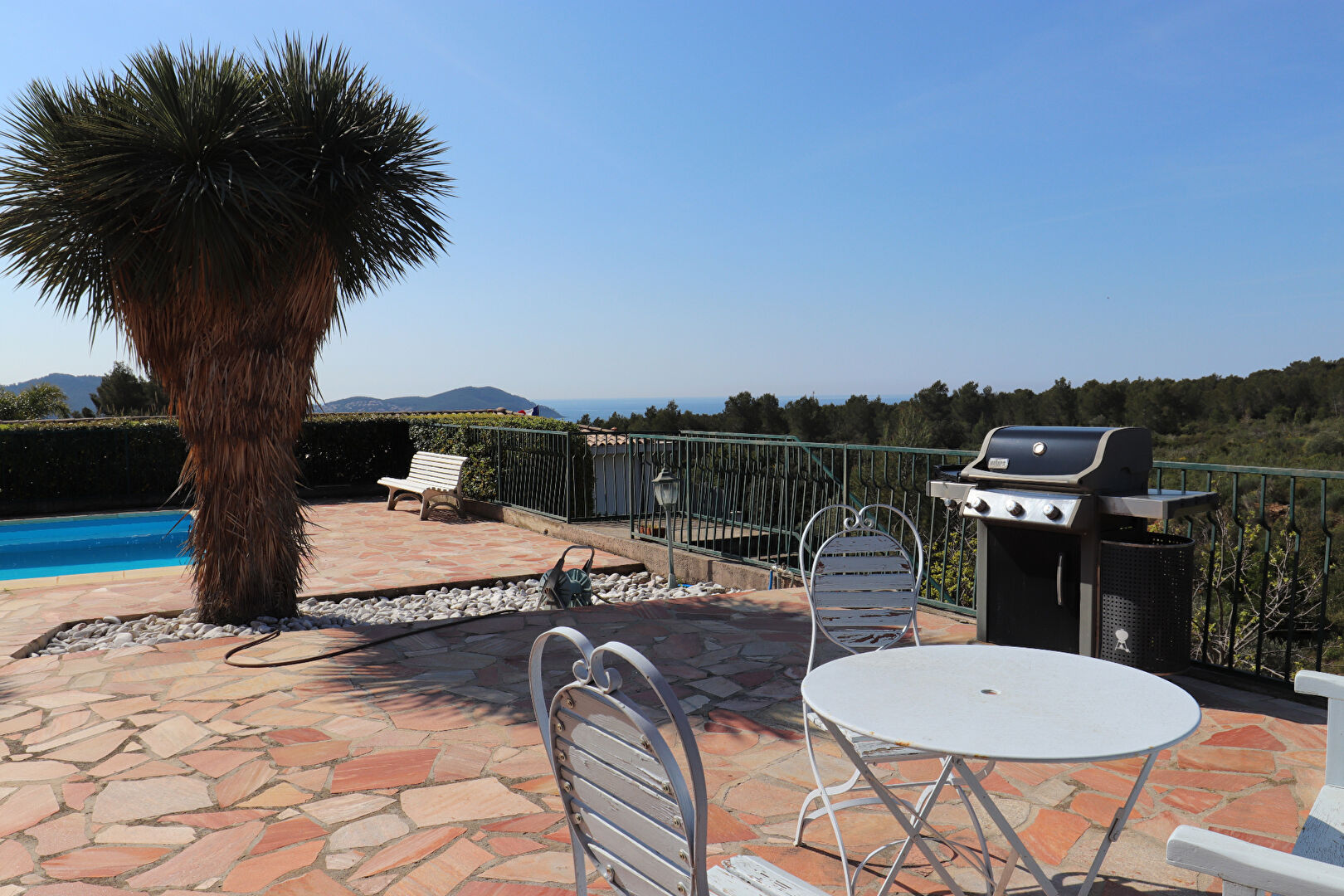LA CADIERE D'AZUR Villa vue mer de 158m² habitables édifiée sur un terrain de 2000m². Situation dominante, cadre campagne avec proximité de la mer. Commerces de ST CYR et gare à 2.5km. Vous découvrirez à l'intérieur un bel espace séjour - salon - cuisine de 63m², un cellier, une suite parentale de 27m² avec chambre - salle d'eau et bureau, une buanderie et garage attenant 15.5m². A l'étage 2 chambres avec une salle d'eau et un toilette. A l'extérieur grande terrasse couverte desservant une dépendance aménagée en chambre avec salle d'eau. Magnifique piscine 10x4 au sel, jardin arboré d'essences méditerranéenne. Grand vide sanitaire, maison climatisée, avec volets roulants et alarme. Mandat n°1104. (3.93 % honoraires TTC à la charge de l'acquéreur.)