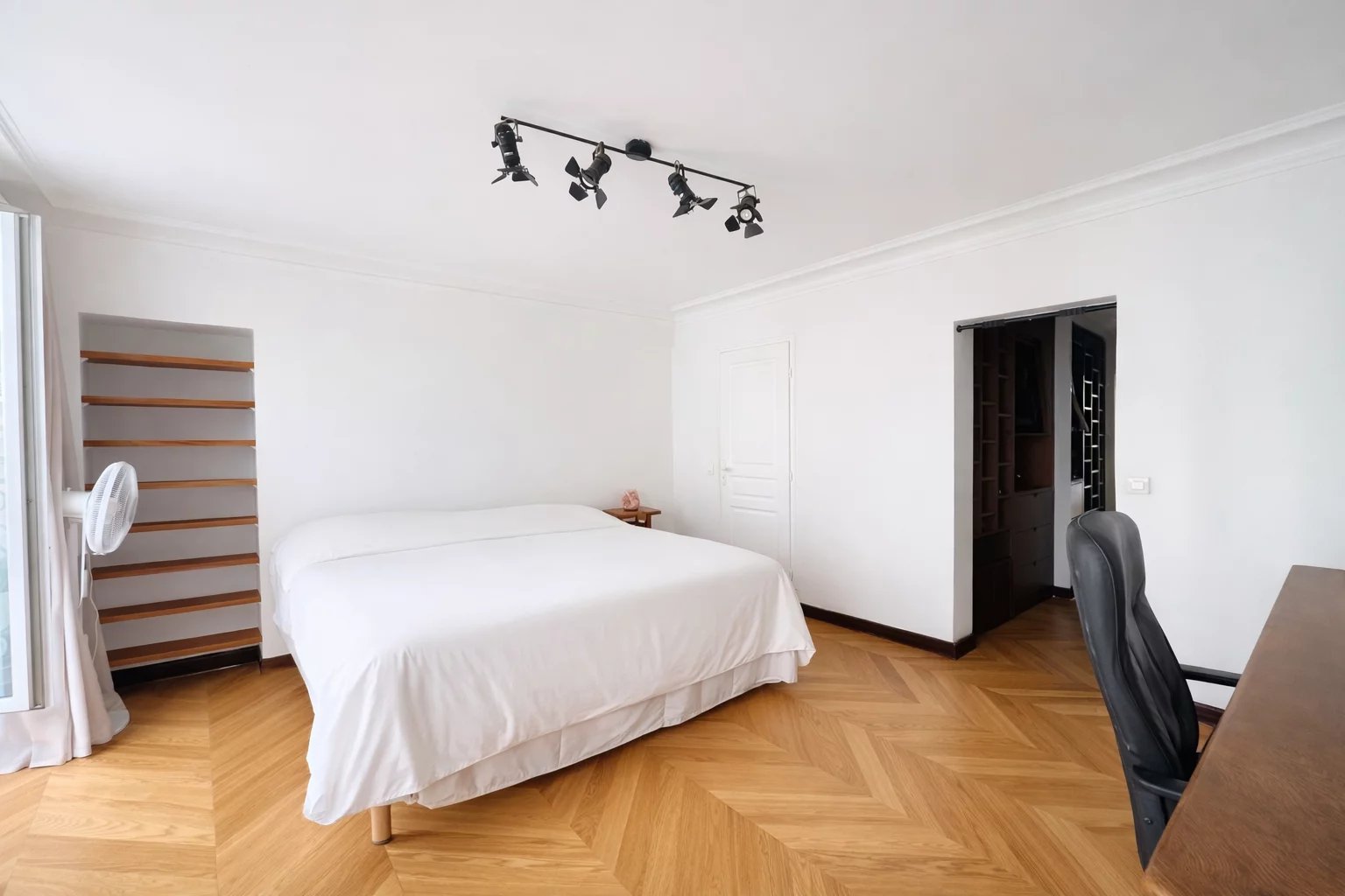 L’appartement s’ouvre sur une entrée menant à un grand séjour – salle à manger exposé Sud, bénéficiant de parquet, moulures et cheminées.