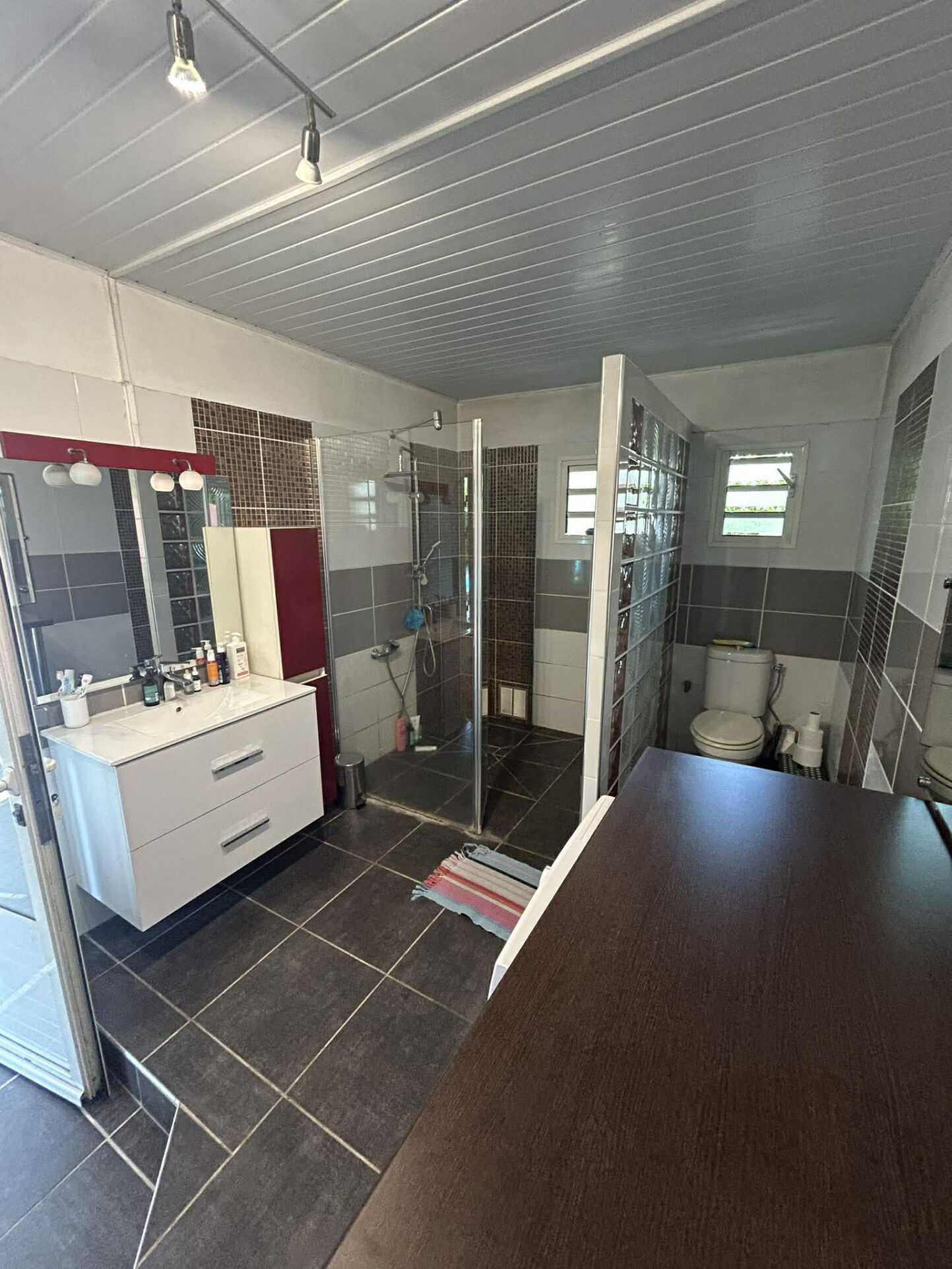 À l'étage, la maison propose trois chambres climatisées supplémentaires, dont une bénéficie d'une terrasse privative. Une salle de bains avec WC ainsi qu'une mezzanine viennent compléter cet espace, cette dernière pouvant facilement être aménagée en bureau ou en coin détente selon vos besoins.