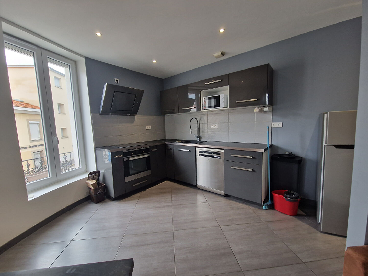 T3 de 66 m² au 26 rue de la richelandiere ST ETIENNE-1er étage sans ascenseur-Entièrement meublé-Grand séjour de 28m² -Cuisine ouverte entièrement équipée (Réfrigérateur, plaque, hotte, lave vaisselle...)-1 chambre de 13m² avec lit double, bureau-Une deuxième chambre pouvant être aménagé en chambre ou bureau au choix-Salle de bain avec douche, machine à laver-WC séparé-Chauffage individuel au gaz-Double vitrage, volets roulants électriques-LOYER 600 euros + 50 euros de charges ( entretien chaudière, TEOM, entretien parties communes)