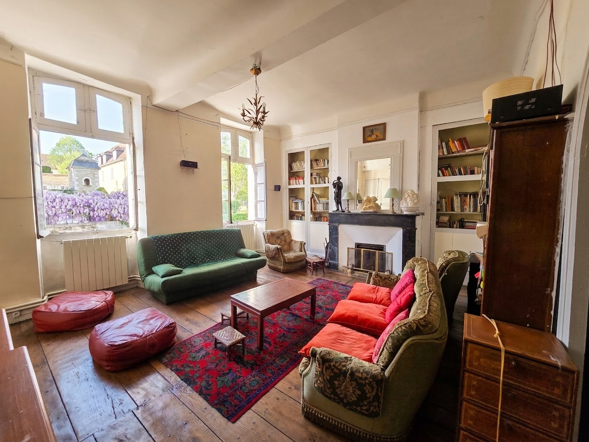La demeure s'organise sur trois niveaux habitables, desservis par deux escaliers distincts (nord et sud), auxquels s'ajoutent des combles aménageables d'environ 180 m2 sous une charpente de belle hauteur. L'entrée s'ouvre sur un hall traversé par un escalier monumental en châtaignier sculpté aux motifs béarnais. De part et d'autre de cet axe, trois pièces de réception se succèdent : un bureau, un salon et une salle à manger, chacune dotée de parquets d'origine, de hauts plafonds et de portes-fenêtres donnant sur le jardin. La grande cuisine donne directement sur une terrasse orientée plein sud, prolongement naturel de la vie domestique aux beaux jours. Buanderie, salle d'eau, toilettes et cave à vin complètent ce rez-de-chaussée.