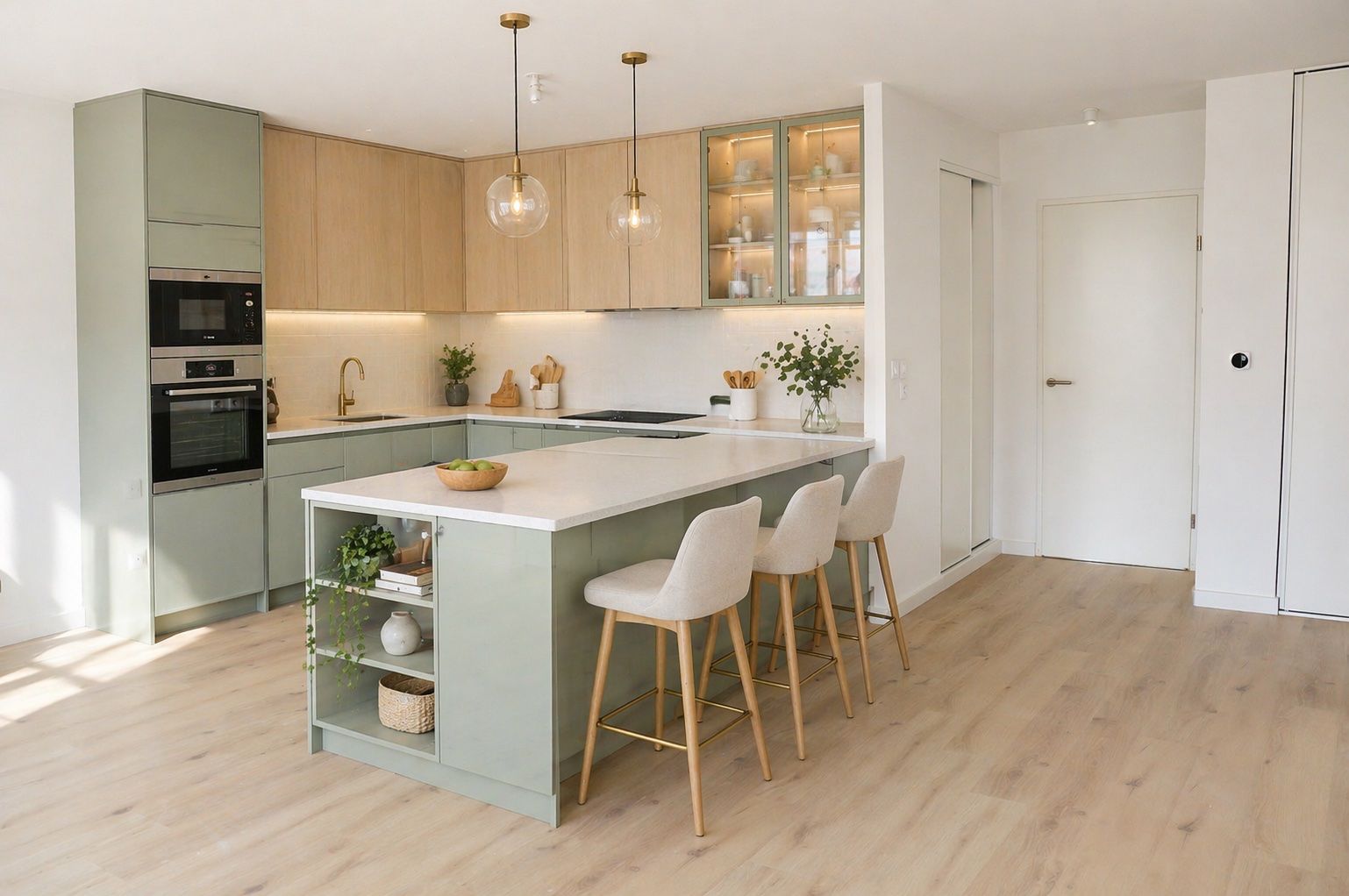 Dès lentrée, un grand cellier, fermé par une porte coulissante, simplifie le quotidien : stockage, poussette, vélos, tout disparaît.