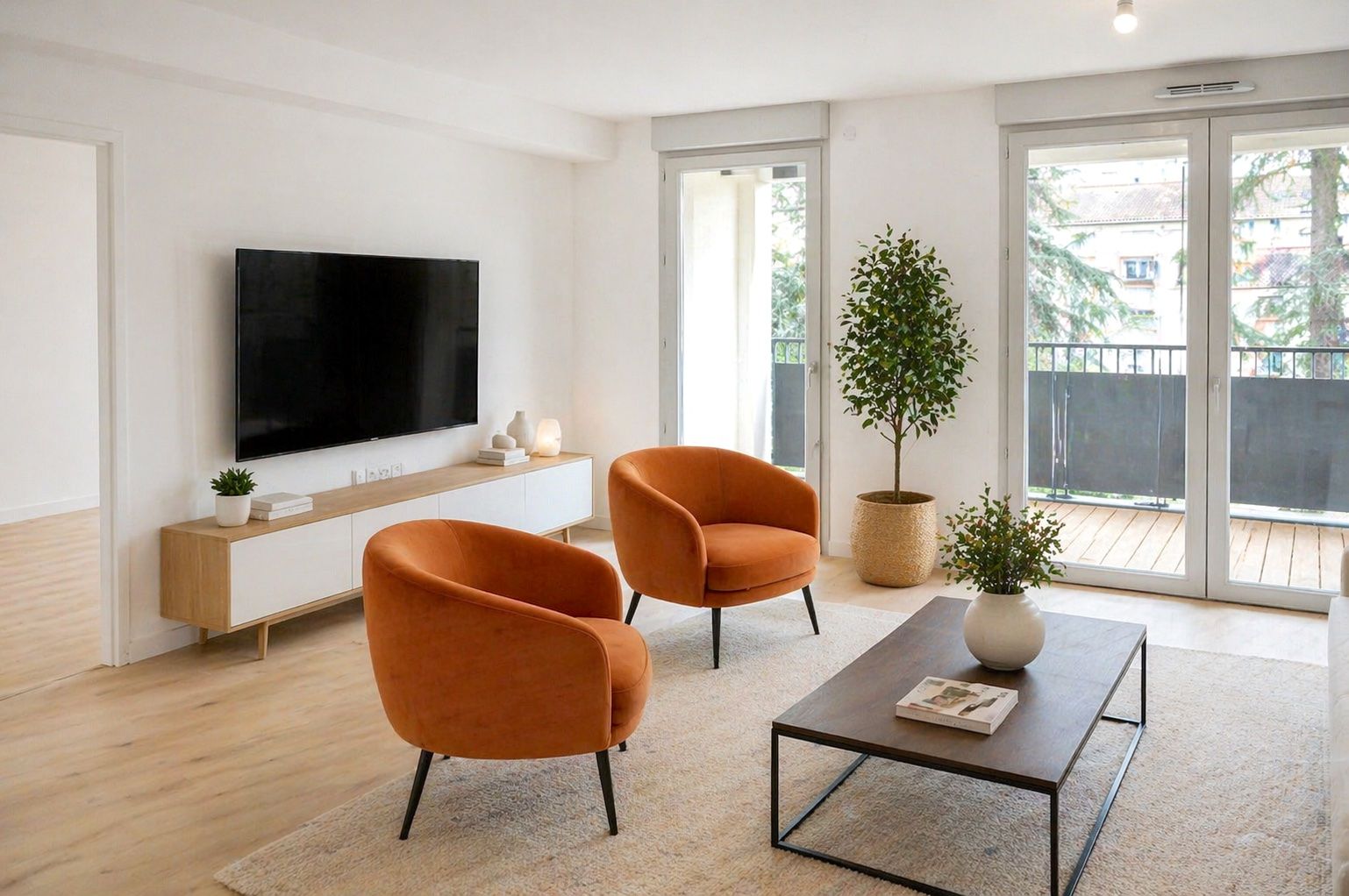 La pièce de vie, lumineuse, souvre sur une terrasse de 9 m2 bien exposée et facile à vivre pour des repas dehors et un coin salon d'été.