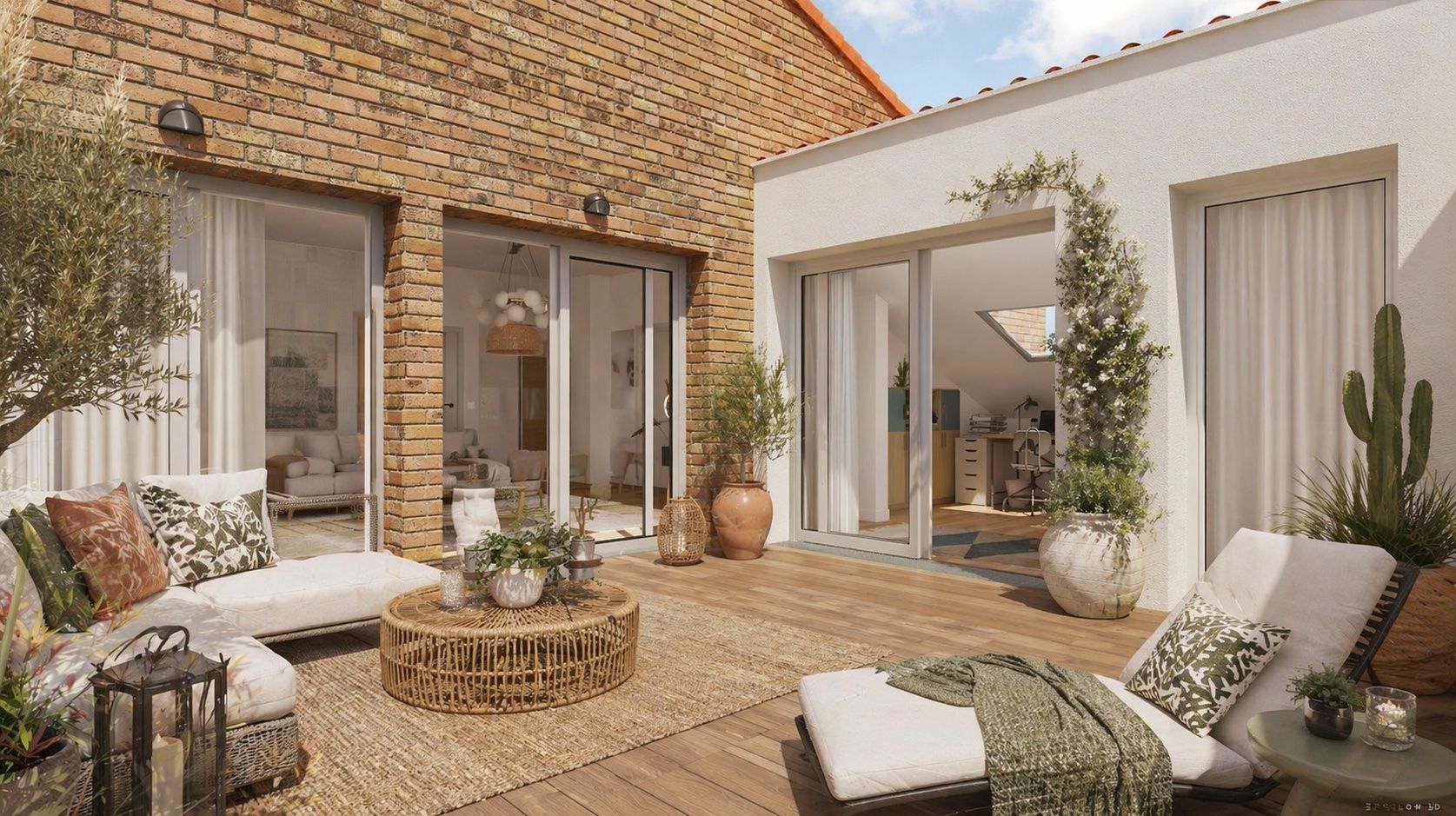 La pièce de vie de 58 m2 structure lensemble : grand séjour + espace cuisine, ouvert via trois larges baies vitrées sur une terrasse tropézienne de 24 m2 à l'abri de tous regard