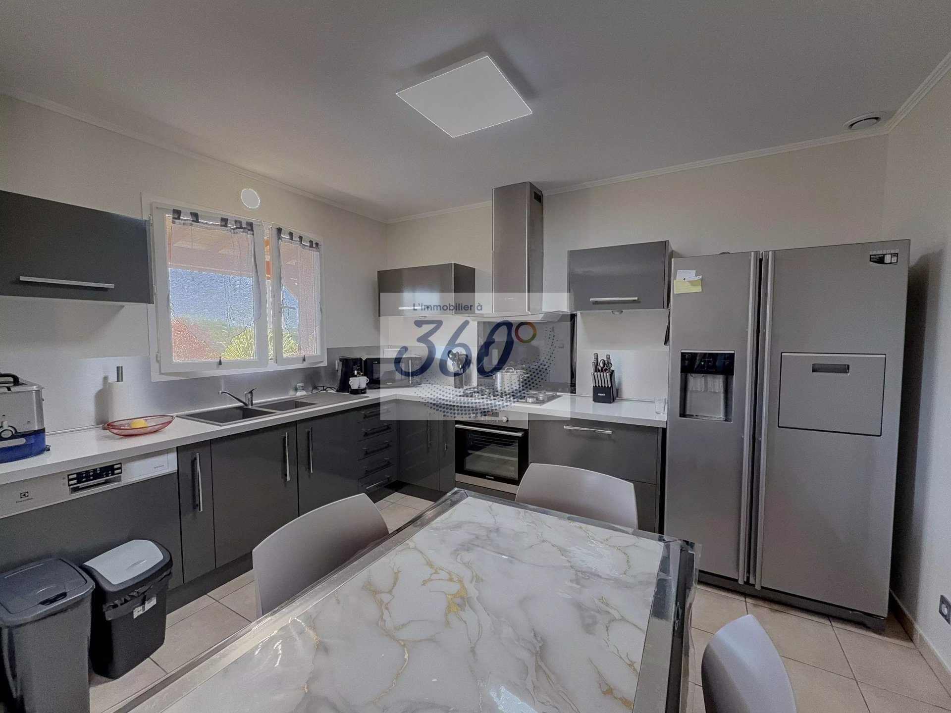Maison moderne Découvrez cette superbe maison de plain-pied d'environ 120 m², idéalement située. Elle se compose de 6 pièces lumineuses, dont un vaste séjour avec cheminée centrale, quatre belles chambres,un grand bureau, et une cuisine aménagée moderne. L'ensemble bénéficie de prestations de qualité telles que le double vitrage, fenêtres PVC, moustiquaires,climatisation réversible centralisée et ventilation simple flux.