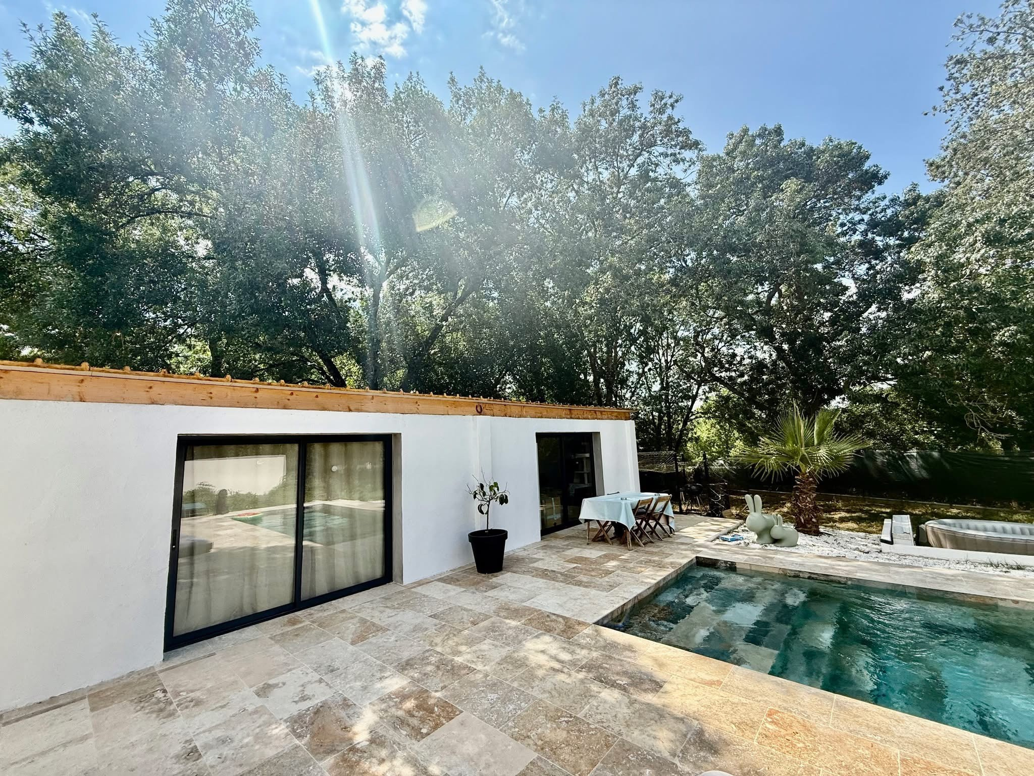 À l'extérieur, le jardin paysager de 864 m2 accueille une piscine en pierre de Bali (traitement au sel automatisé) et une dépendance aménagée, idéale pour recevoir ou télétravailler.